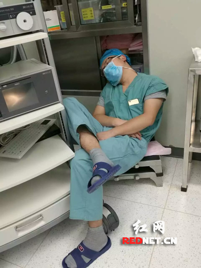 中南大学湘雅二医院耳鼻喉科医生尹丹辉在连续10小时手术后,侧斜坐在手术室内的踏脚凳上睡着了。