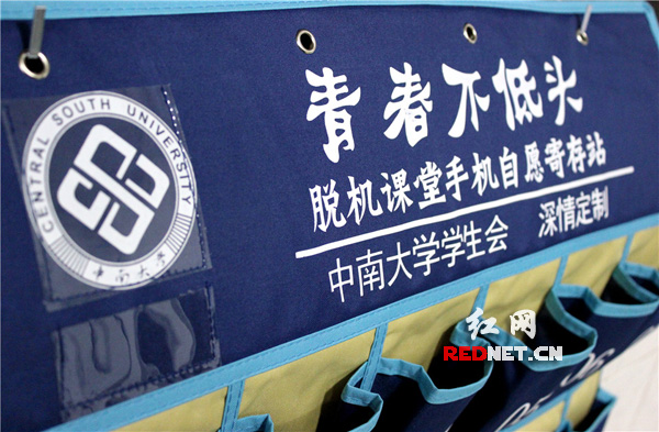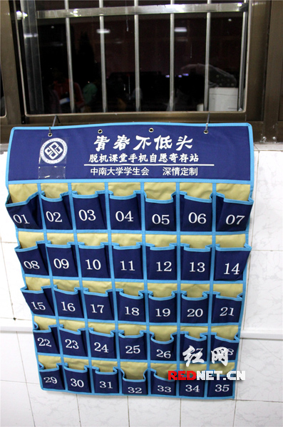 中南大学开展“无手机课堂”活动,“青春不低头,脱机课堂手机自愿寄存站”的字样被印制在一个由35个小袋子组成的大收纳袋的顶部。