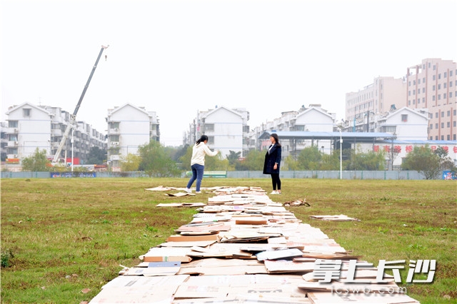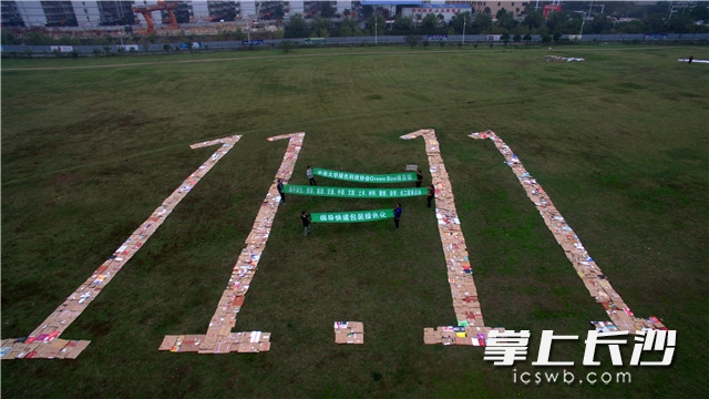 在中南大学体育场旁的草坪上,10多名志愿者用了两个小时把这些快递纸箱摆成了巨大的双十一造型,用无人机拍摄,以此提醒人们关注快递包装资源浪费的现状。